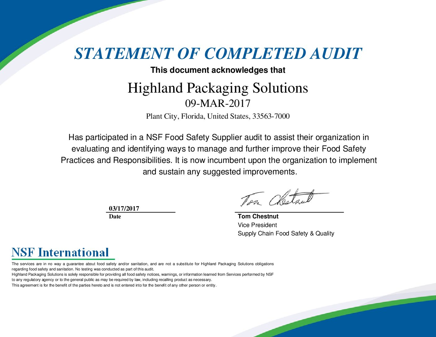 Highland Packaging Solutions has participated in a NSF Food Safety Supplier audit to assist their organization in evaluating and identifying ways to manage and further improve their Food Safety Practices and Responsibilities. It is now incumbent upon the organization to implement and sustain any suggested improvements. A copy of the NSF Statement of Completed Audit is available to download.